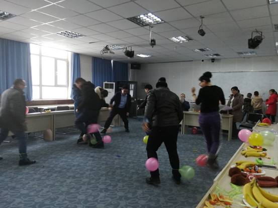 活动开始,张丽娟副书记对过去一年广大教职工的工作和努力给予充分的肯定,并代表学院向大家致谢,同时为在校的教职工送上节日的祝福,祝大家新的一年诸事顺利、万事如意。随后,“迎新春”趣味活动在热烈的欢声笑语中展开,有“幸运抽奖”、“踩气球”、“抢凳子”、“识对联”、“蒙眼画萌猪”、“猜谜语”、“脑筋急转弯”等环节,踩气球游戏更是将活动推向高潮,大家在你追我逐中既要想方设法踩爆对方的气球,还要全力保护自己脚上的气球不被别人踩破,场上的选手斗智斗勇,场下观众捧腹大笑……。随着活动的继续,幸运篮球、淘气的毛绒公仔、火红的对联、甜蜜的糖果等奖品都找到了自己的主人。最后学院党委书记周保平再次代表学院向在校过年的老师表达了节日的祝福,希望大家寒假好好休息,以饱满的精神迎接新学期的到来!本次“迎新春”趣味活动在老师们甜蜜的笑声中,在老师们收获丰厚的奖品和新年的祝福的笑脸中落下了帷幕。