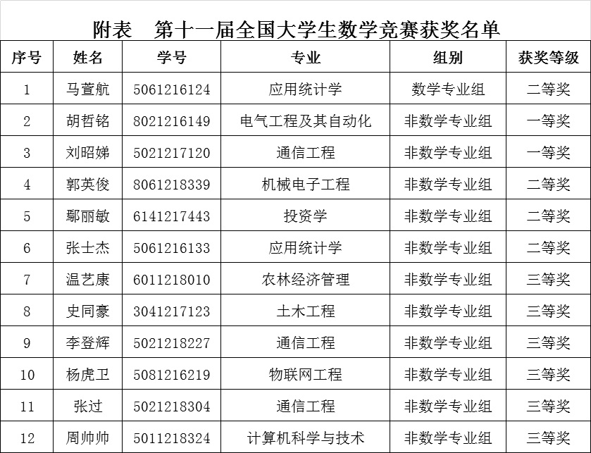 10月26日,第十一届全国大学生数学竞赛在全国各高校同时进行,我校学生获得新疆赛区数学专业组二等奖1项,非数学专业组一等奖2项、二等奖3项、三等奖5项,其中胡哲铭同学被推选参加全国总决赛。