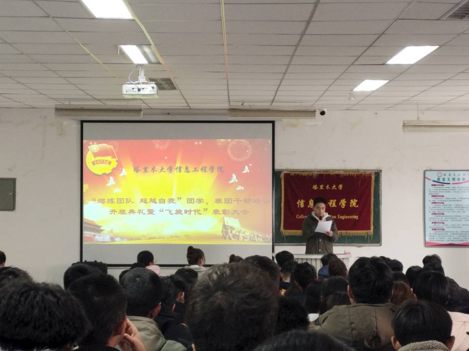 为加强对班团干部的教育与管理,提高政治素质及理论水平,表彰“飞旋时代”晚会优秀人员,11月24日下午,信息工程学院在逸夫楼阶教12开展“熔炼团队超越自我”团学、班团干部培训班开班仪式暨“飞旋时代”表彰大会。学院党委副书记张丽娟带领辅导员陆天、王星原、李文凤、许库尔参加大会,会议由团委副书记潘莎莎主持。