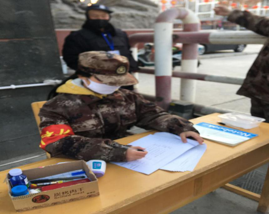 网络工程2019级1班团支书严晓慧在甘肃省武威市凉州区羊下坝镇参与防疫志愿服务,每天在村口协同值班,对进出人员测量体温。“在疫情面前,我们虽然没有医者的妙手回春,没有太多的物资可以捐赠,但我们有体力、有热情,与一线工作者同心,共战疫情!”她说。