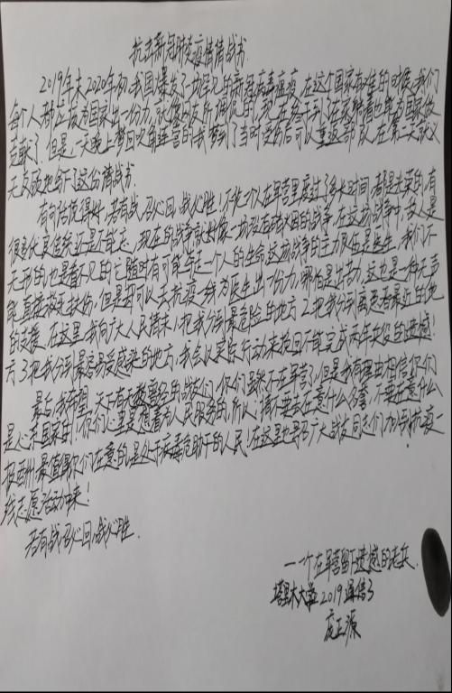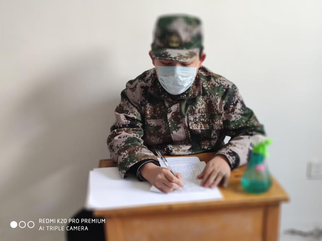 庞正源是信息工程学院通信工程2019级3班的一名当过兵的大学生。放寒假后,回到家中的他看到家乡受到疫情严重影响,他再也按耐不住心中急切参与抗疫的激动之情。2月16日,他主动向山东省菏泽市武装部递上了抗疫请战书。“作为一名当过兵的大学生,我有责任、有义务为抗击疫情做出力所能及的事情。”庞正源说。