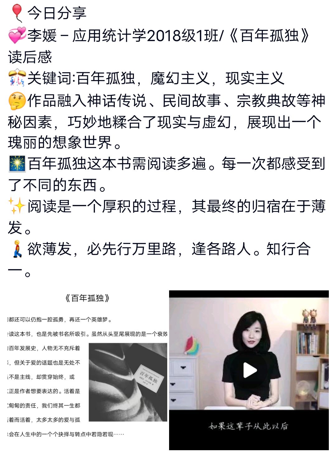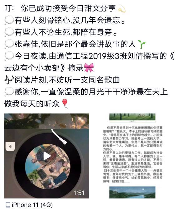 “全民阅读挑战,你敢应战吗?” 大学生读书会主要由团学干部策划文案,精心编辑每篇参赛同学的读后感以早读和晚读的形式分享给大家。为了吸引各位同学的目光还添加了小视频,音乐,广播剧,图片等内容发到QQ空间,获得了大量的点赞量和转发量,受到了一致好评。刘倩–《云边有个小卖部》共32人转发,获1181人点赞。贺泗才–《追风筝的人》共17人转发,获685人点赞。王雪–《撒哈拉的故事》共27人转发,获629点赞,这些优秀的作品都让人满载而归。本次活动共由21位同学对自己心目中经典书籍的真情流露与大家共度了这短暂又美好的12天,这21位同学的作品或妙笔生花,或行云流水带领大家领略了不同文学笔下的风采,各位同学的积极点赞与转发也体现出了大家对于阅读,对于文学艺术的热爱。