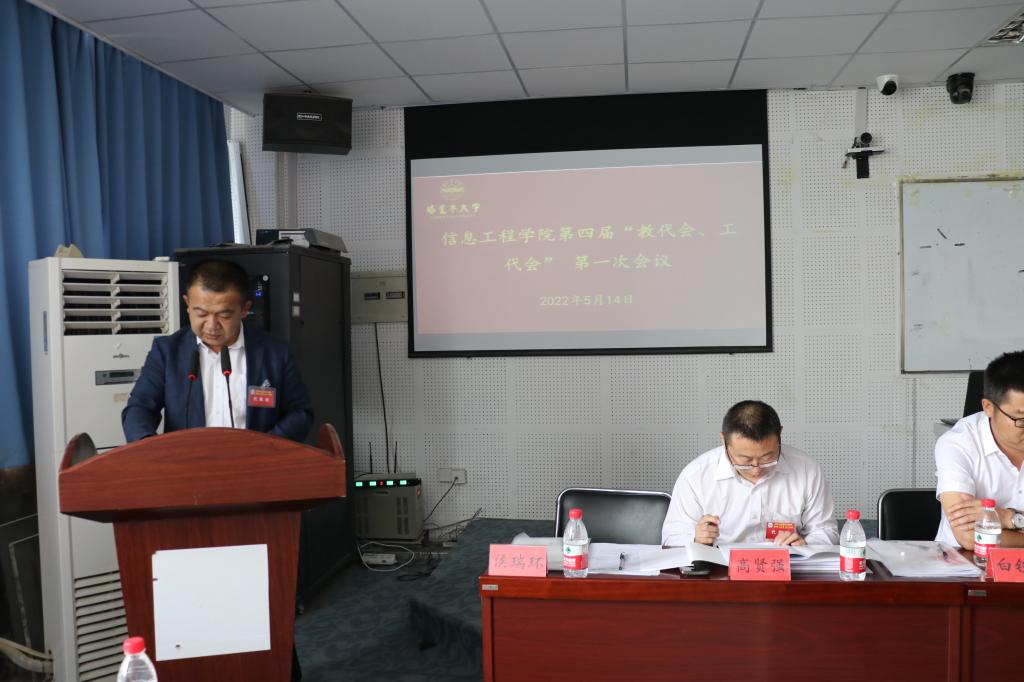 5月14日上午,信息工程学院第四届“教代会”暨“工代会”第一次全体会议圆满召开,学院党委书记周保平,院长张学东,副院长白铁成,工会副主席侯瑞环,党委委员邬欢欢,纪委委员高贤强,系主任孟洪兵,系书记江伟,工会代表40余人参加了会议。会议由白铁成主持,在逸夫教学楼203会议室举行。