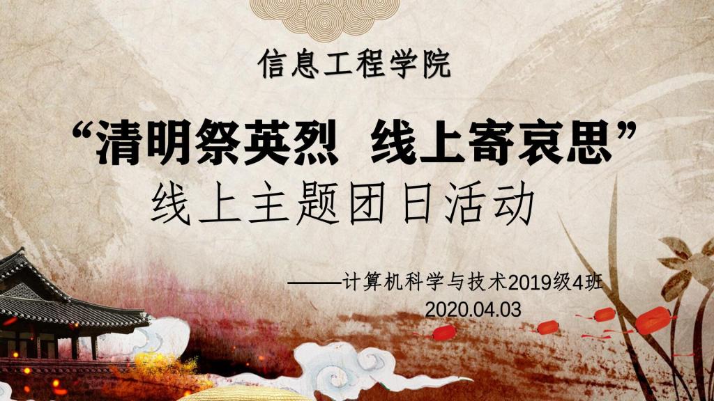 为进一步弘扬中华民族优秀传统文化,深切缅怀先烈的丰功伟绩,加强信息学子思想政治引领和革命传统教育,2020年4月2日-4月7日,信息院52个团支部通过钉钉、腾讯会议等视频形式开展“清明祭英烈·线上寄哀思”为主题的团日活动。