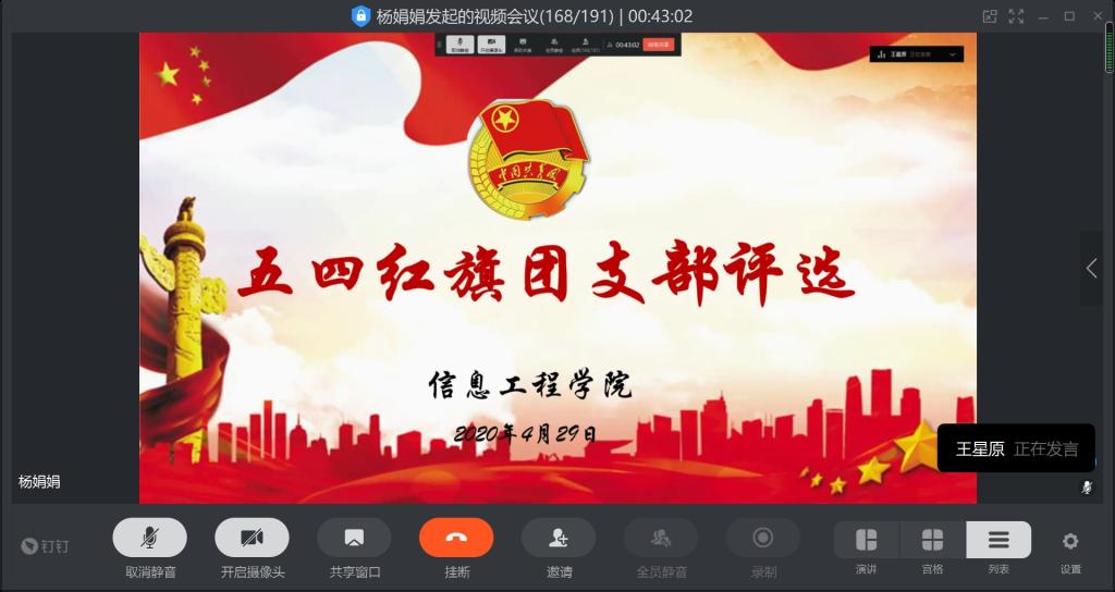 为深入推进基层团组织建设,深化创先争优工作,鼓舞和激励基层团组织和广大团员、团干部勤奋学习、扎实工作,2020年4月29日下午,信息院通过钉钉视频会议形式开展校级“五四红旗团支部”推荐评选答辩会。