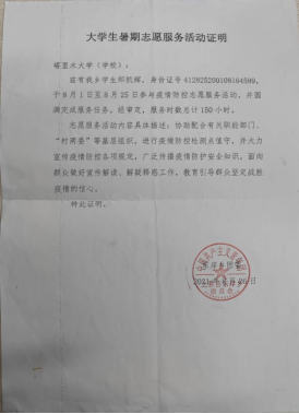 在此期间,他积极向社区、村委提出申请,请求加入当地青年志愿服务队伍中。据悉,郏凯辉于8月1日开始参加志愿服务活动直至8月25日,志愿服务时长累计长达150小时。郏凯辉以实际行动助力受灾地排水、抢救物资、基层核酸检测、“两码核验”、消杀清洁等工作。在暴雨与“疫情”的考验面前,作为胡杨学子的郏凯辉勇担青年之责,承担家国之任,踏“汛”而行,闻“疫”而动,与广大志愿者共筑起“抗洪防疫”的“青春堤坝”。