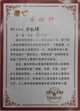 近期,信息院团委收到一封来自河南上蔡县团委的表扬信,信中对来自电子信息工程2021级的郏凯辉在暑假期间参加志愿服务的工作表现给予了高度肯定及赞扬。