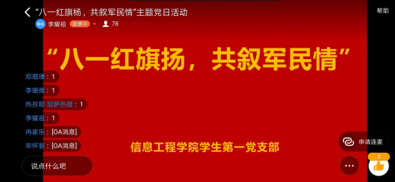 8月1日下午,信息院学生第一党支部在钉钉线上开展“八一红旗扬,共叙军民情”主题党日活动。