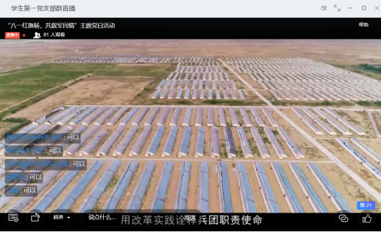 支部邀请退伍军人何甜和赵博为我们分享了在军营中的血与泪、苦和乐,让我们切身感受到军人的不易。随后观看了《红色团场·沙海明珠》宣传片,了解了新疆生产建设兵团四十七团老兵镇的故事,沙海老兵的光辉事迹,纪录着新时代兵团人的崭新作为,深入学习何为“老兵精神”。同时观看纪录片《最可爱的人——献给所有抗洪一线的战士》 ,了解了在抗洪一线,人民解放军是如何不畏艰险、迎难而上,为了祖国和人民不顾一切,牺牲一切!
