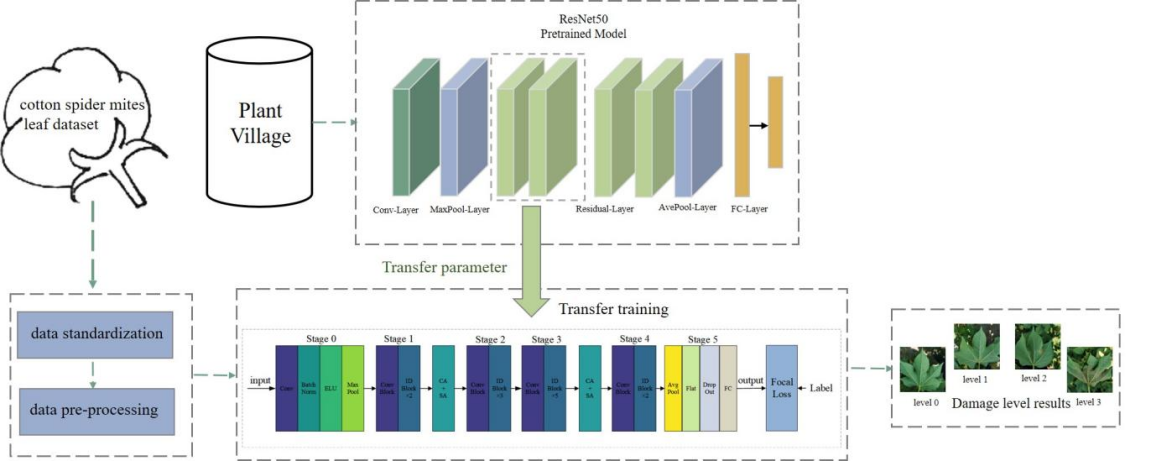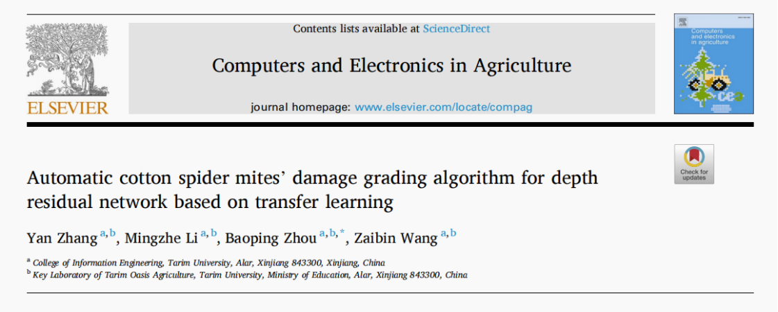 7月13日,塔里木大学信息工程学院周保平教授团队在农林科学领域国际权威期刊Computers and Electronics in Agriculture(中科院一区Top期刊,IF:8.3)在线发表了题为“Automatic cotton spider mites’damage grading algorithm for depth residual network based on transfer learning”的研究论文。研究提出了一种基于迁移学习和改进残差网络的棉叶螨检测及危害等级识别方法,实现对棉叶螨的检测和危害等级的识别,对我国周期性数字化防治和管理棉叶螨以及全球可持续农业生产等方面具有重要的意义。