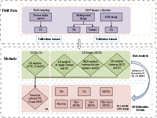 在该研究中,使用同时搭载多光谱相机和RGB相机的六旋翼无人机作为遥感数据获取平台,通过ENVI软件从棉花黄萎病遥感影像中提取植被指数(VI)、颜色指数(CI)以及纹理特征。通过一元和多元线性回归,确定VI、CI、纹理特征和棉花黄萎病病情指数(DI)之间的相关性。采用灰狼优化(GWO)极限学习机(ELM)和粒子群优化(PSO)反向传播神经网络(BP)模型,探究各模型对棉花黄萎病病情程度的估测能力,发现结合植被指数、颜色指数和纹理特征的协同建模方法,能显著提高病情的估测精度,验证集的R2在花期为0.65(RRMSE=42.96),在花铃期为0.66(RRMSE=20.00),在铃期为0.88(RRMSE=10.53),为今后利用低空遥感监测作物病害状况提供思路和方法。(文/张楠楠)