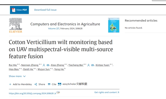 2024年1月19日,塔里木大学信息工程学院白铁成教授团队在《Computers and Electronics in Agriculture》(SCI,中科院一区Top期刊,JCR农业综合学科排名第一,IF:8.3) 发表了题为“Cotton Verticillium wilt monitoring based on UAV multispectral-visible multi-source feature fusion”的研究论文。该研究提出了一种新的棉花黄萎病检测方法,该方法结合了植被指数(VI)、颜色指数(CI)和纹理特征,旨在提高基于无人机(UAV)图像的棉花黄萎病(CVW)疾病严重程度估计精度。张楠楠副教授、白铁成教授为共同通讯作者、硕士研究生马瑞为第一作者。该研究得到国家自然科学基金、兵团科技项目和塔里木绿洲农业教育部重点实验室的支持。