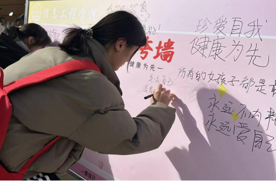 活动现场气氛热烈。同学们踊跃参与,纷纷在展板上写下对自己及身边女性的夸赞与鼓励。“愿你成为自己的光,无需凭借任何人。”“爱你老妈!”“所有女孩子都是最棒的!”……一句句暖心话语,饱含着深厚情感,展现出大家对女性力量的珍视和赞美。