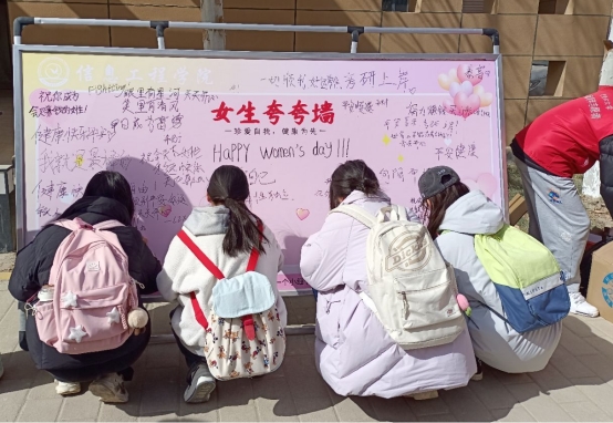 2025年3月7日,为庆祝三八妇女节的到来,塔里木大学信息工程学院在食堂东门开展“女生夸夸墙,致敬她力量”主题活动,活动旨在弘扬女性自尊、自信、自立、自强的精神,表达对女性的关爱与祝福。