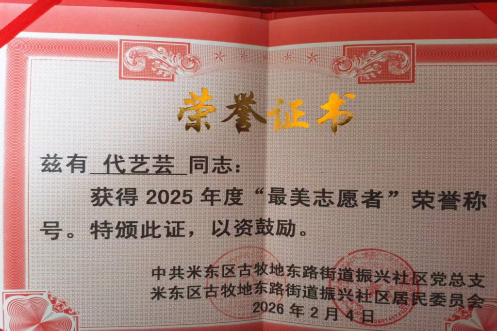 为积极响应2026年寒假“返家乡”社会实践活动号召,引导青年学子在服务家乡中受教育、长才干、作贡献。塔里木大学信息工程学院学生代艺芸,在新疆维吾尔自治区乌鲁木齐市振兴社区参与了为期一个月的综合服务组学生负责人岗位实践。